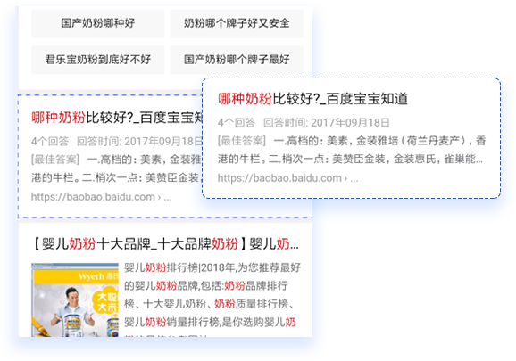 潛在需求階段:您可以在用戶(hù)處于潛在需求階段,在百度知道與您自身業(yè)務(wù)相關(guān)的問(wèn)題上植入廣告。您通過(guò)回答問(wèn)題的方式生成專(zhuān)屬的問(wèn)題頁(yè)面,在搜索結果頁(yè)、知道詳情頁(yè)展現。用戶(hù)在查閱答案時(shí)就不知不覺(jué)查看了廣告